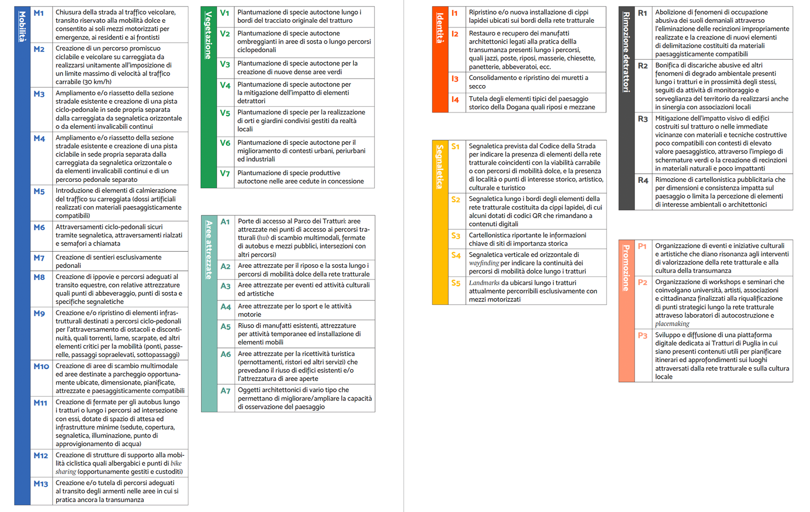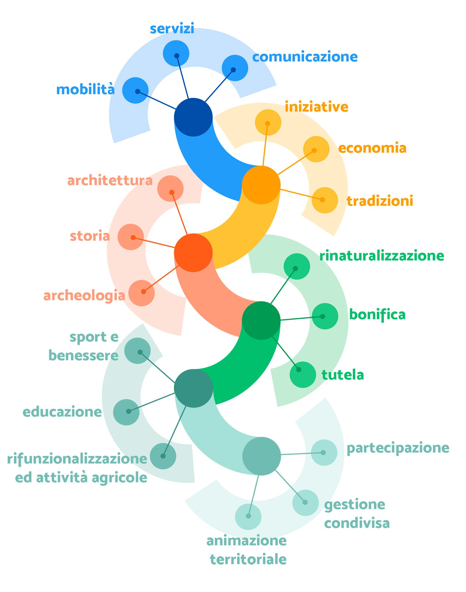 - definizione delle linee guida e di un abaco di interventi progettuali relativo ai temi chiave della valorizzazione multifunzionale della rete, ovvero mobilità, infrastrutture verdi, aree attrezzate, identità culturale, divulgazione, gestione;