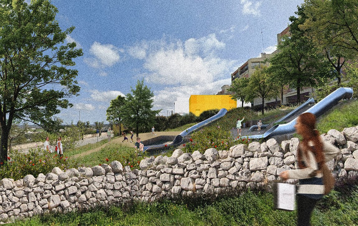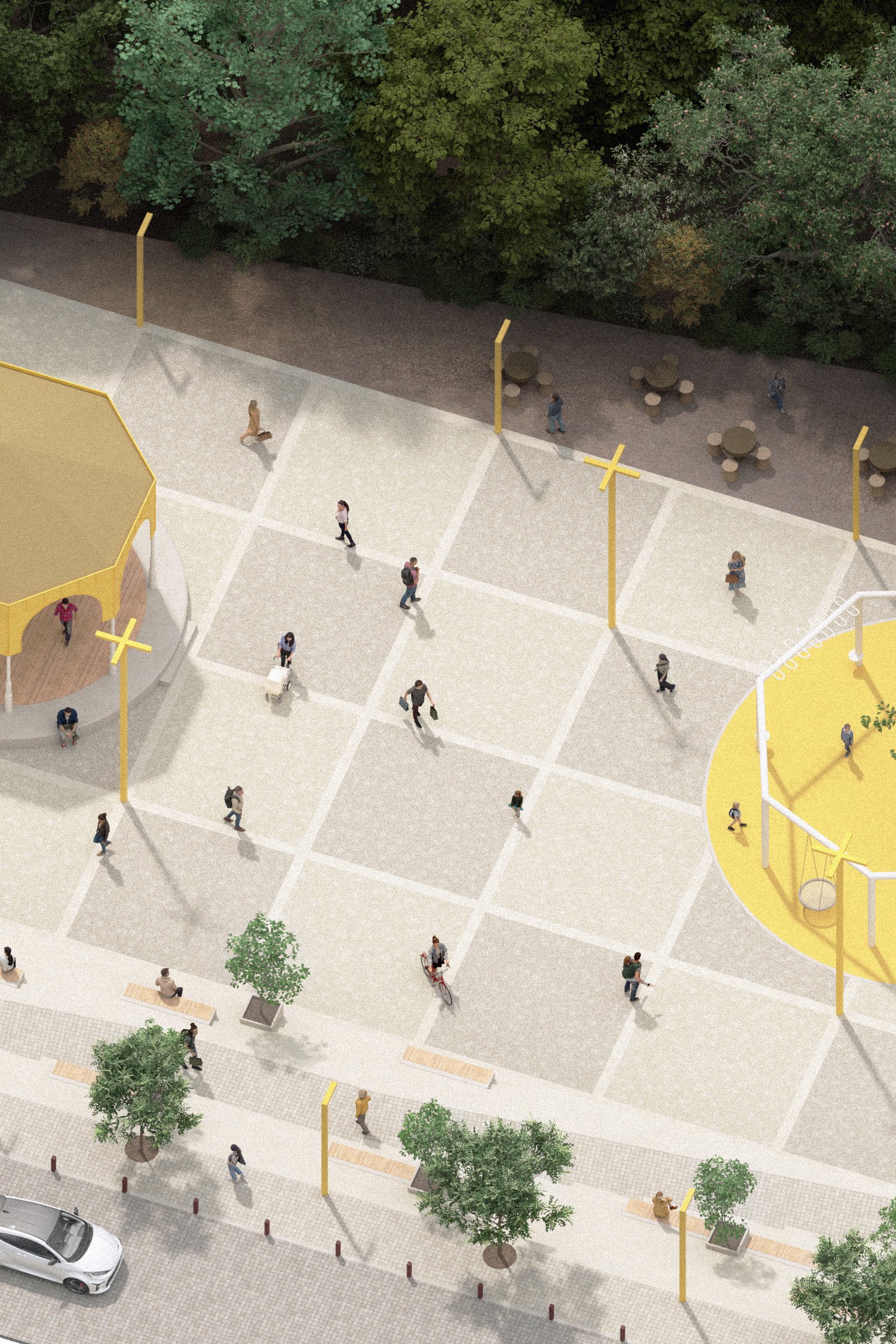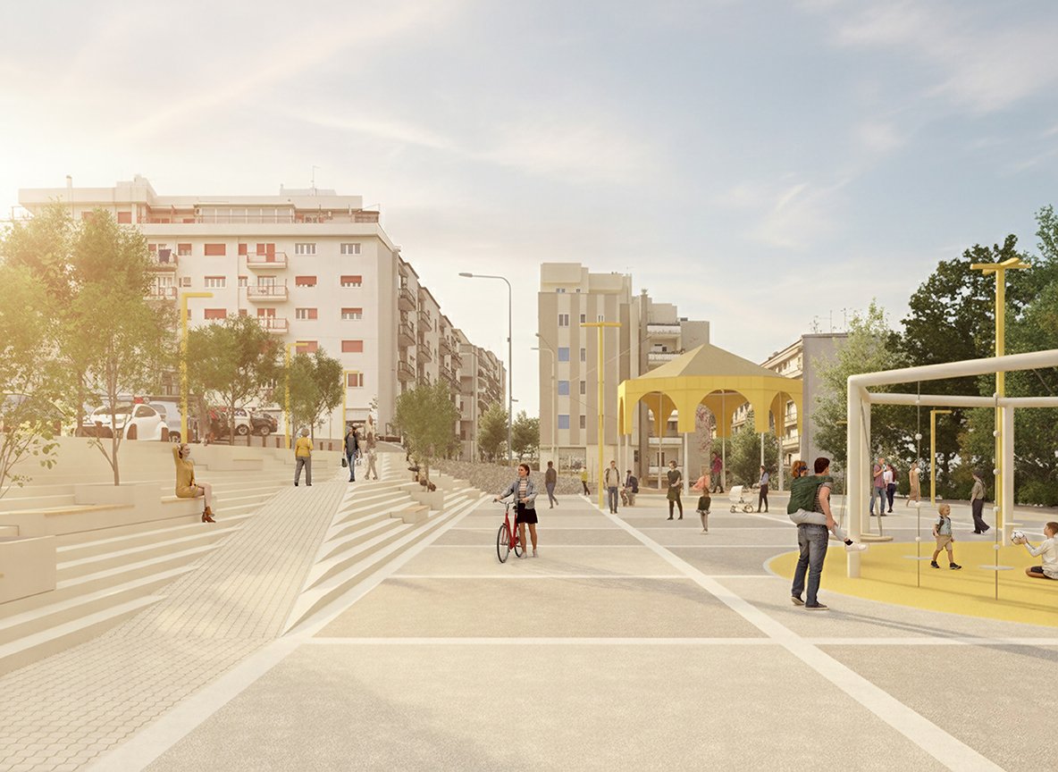 La strategia urbana si traduce in un abaco di azioni progettuali complementari tra loro: la creazione di una nuova piazza in sostituzione di un edificio degradato in abbandono; l’accessibilità e l’annessione al sistema degli spazi pubblici del bosco esistente, la riqualificazione degli assi viari attribuendo una nuova centralità alla mobilità lenta, nuove aree destinate al gioco intergenerazionale. Oltre a migliorare la vivibilità e l’attrattività del quartiere, il progetto ambisce a creare una nuova identità distintiva, valorizzandone i punti di forza, a partire dalla relazione scenografica che lega il costruito con il contesto paesaggistico che lo circonda.