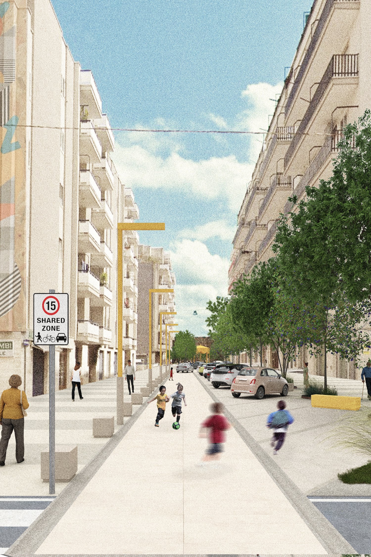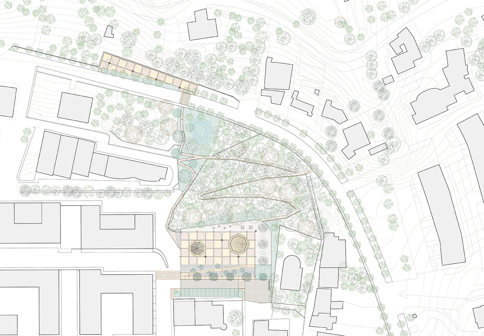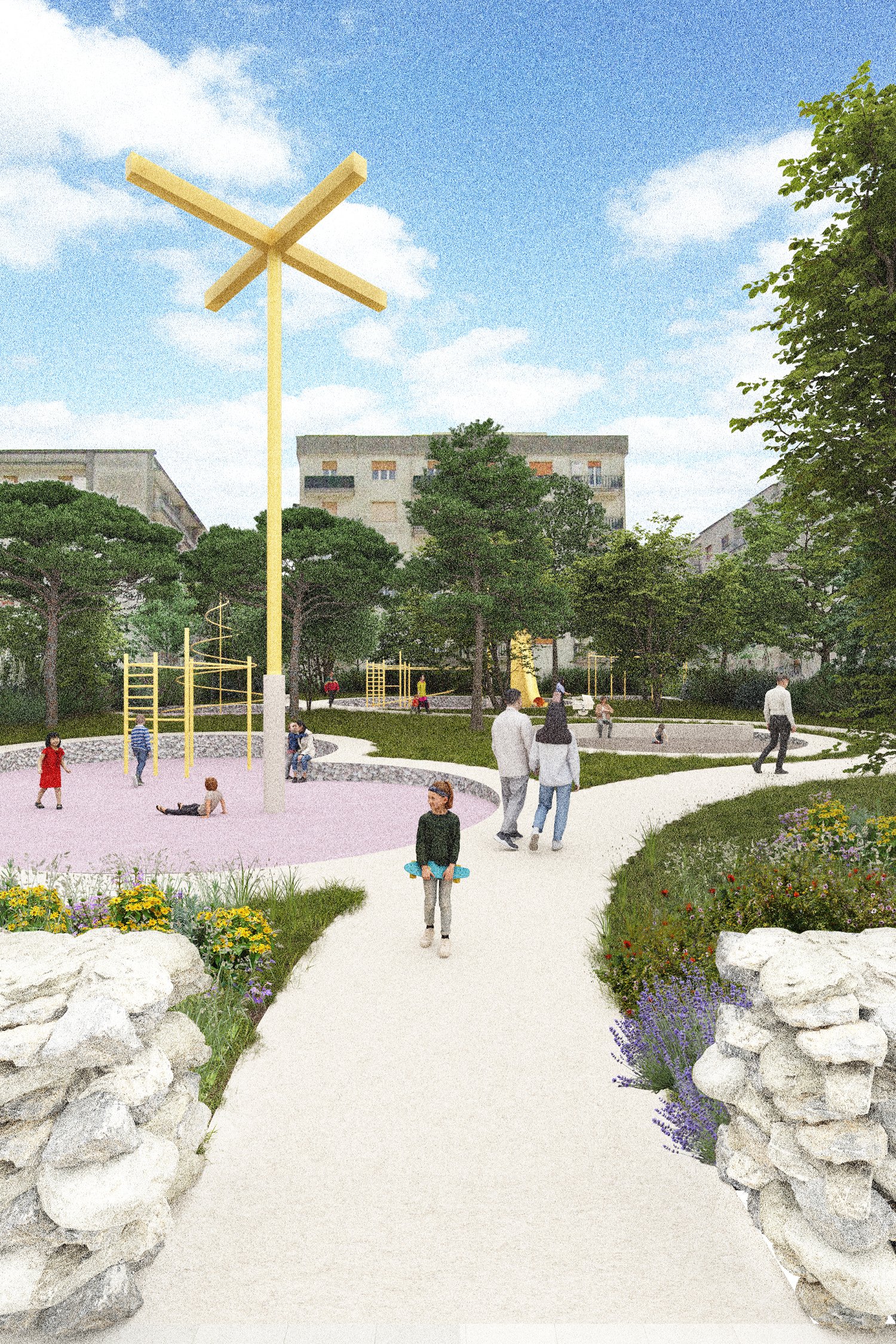 La strategia urbana si traduce in un abaco di azioni progettuali complementari tra loro: la creazione di una nuova piazza in sostituzione di un edificio degradato in abbandono; l’accessibilità e l’annessione al sistema degli spazi pubblici del bosco esistente, la riqualificazione degli assi viari attribuendo una nuova centralità alla mobilità lenta, nuove aree destinate al gioco intergenerazionale. Oltre a migliorare la vivibilità e l’attrattività del quartiere, il progetto ambisce a creare una nuova identità distintiva, valorizzandone i punti di forza, a partire dalla relazione scenografica che lega il costruito con il contesto paesaggistico che lo circonda.