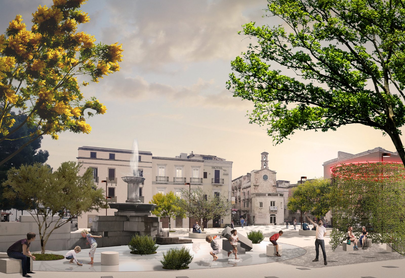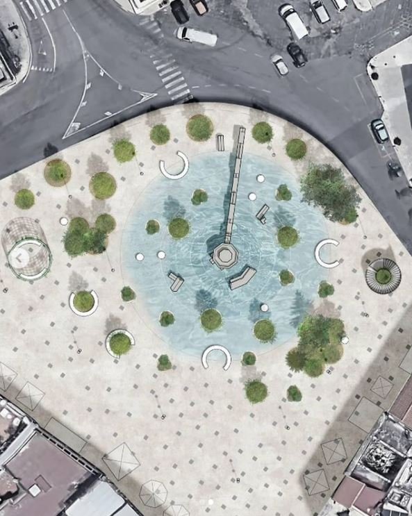 Il concetto stesso di fontana viene reinterpretato: l’acqua non è più confinata al solo elemento scultoreo, ma diventa principio ordinatore dell’intera piazza. Attraverso un sistema di raccolta e riuso delle acque meteoriche, lo spazio pubblico assume configurazioni variabili in relazione alle condizioni climatiche e alle esigenze d’uso. La piazza può ospitare uno specchio d’acqua temporaneo, attivare getti a raso integrati nella pavimentazione oppure configurarsi come superficie completamente asciutta e pienamente praticabile. In tal modo, lo spazio si trasforma in un dispositivo dinamico, capace di alternare dimensione scenografica e funzione ludica, rafforzando l’identità del luogo e la sua attrattività sia per la comunità locale sia per i visitatori.